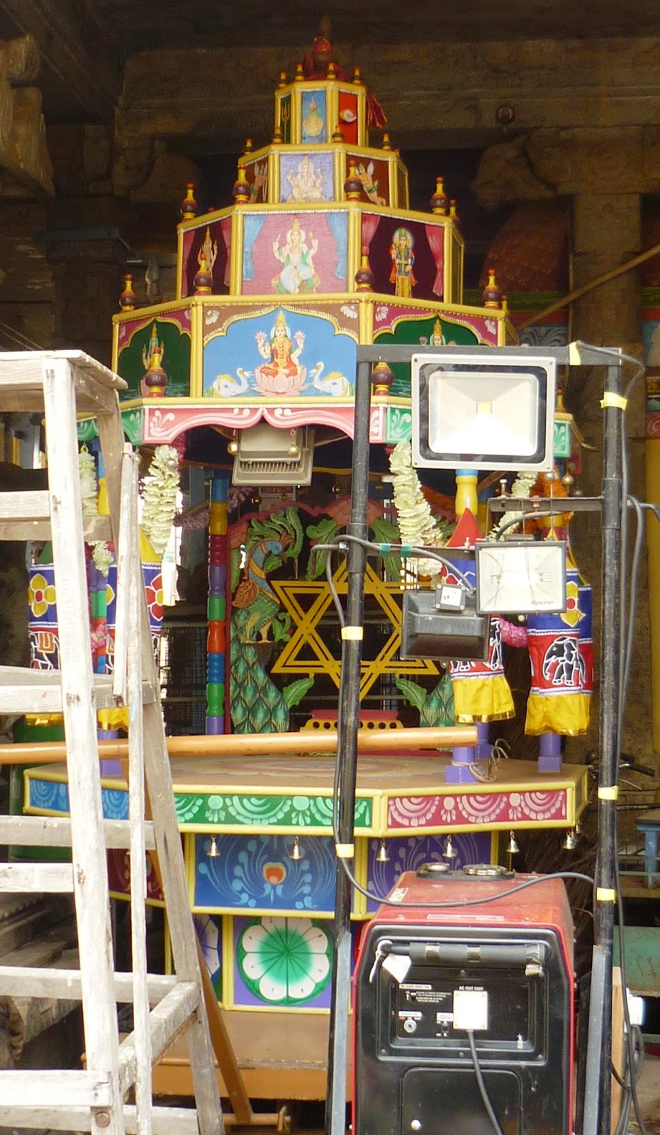 சிவன் கோயில் இரதத்தில் இருக்கும் விநாயகர். நான்கு அடுக்கு உச்சியில் இருக்கிறார். கீழ் அடுக்கில் அஷ்ட லெக்ஷ்மிகளும் அருள் பாலிக்கிறார்கள். மேலே முருகன் பார்வதி . அவர்கள் மேலே விநாயகர்.